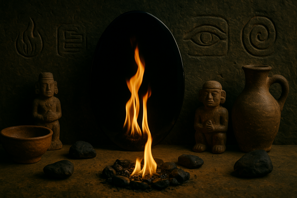 Ceremony of the obsidian knife, purification, offering, and rebirth through sacred elements.